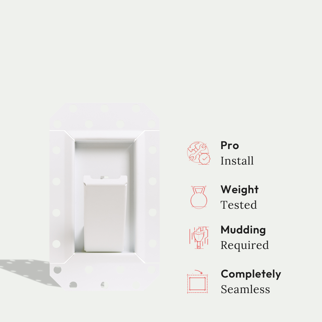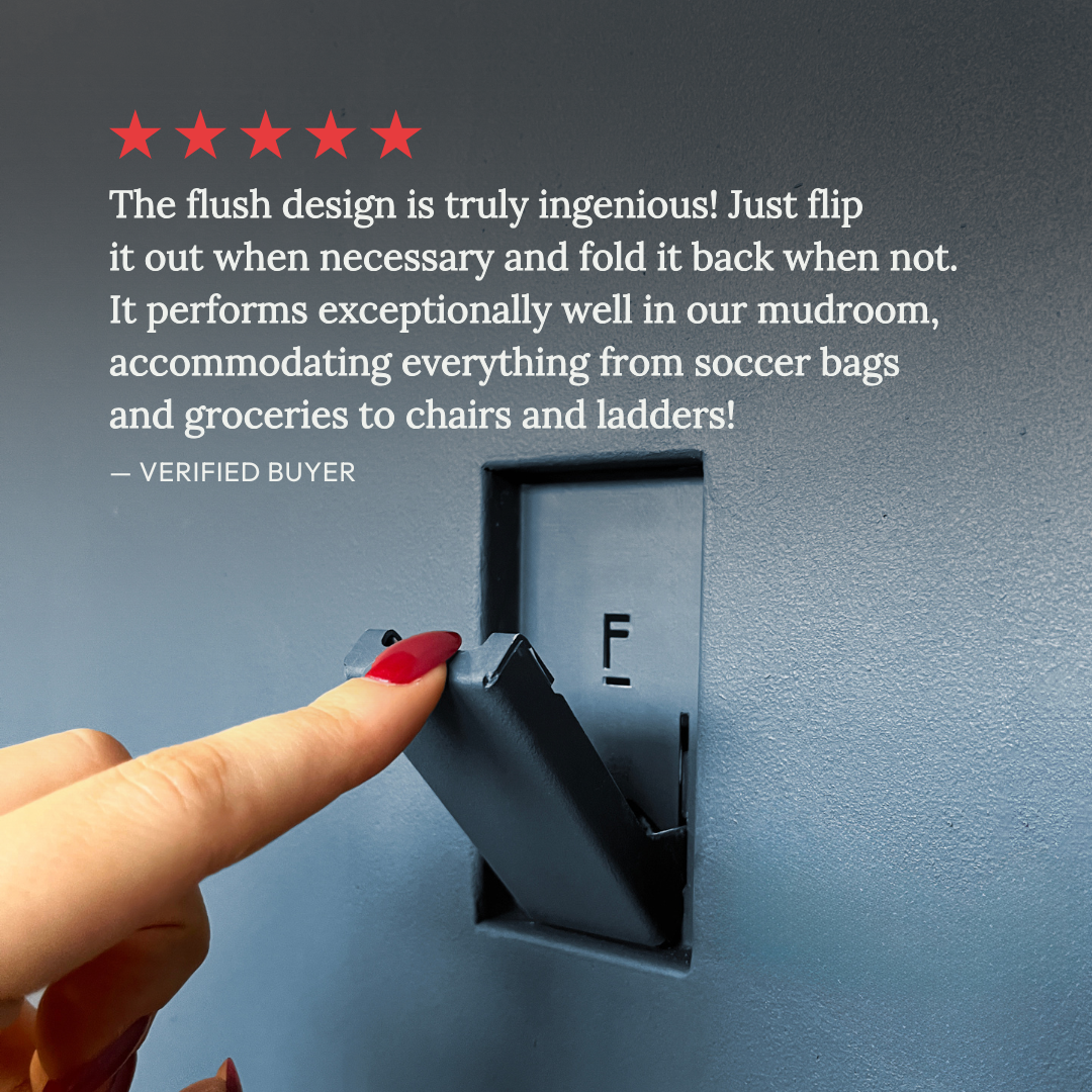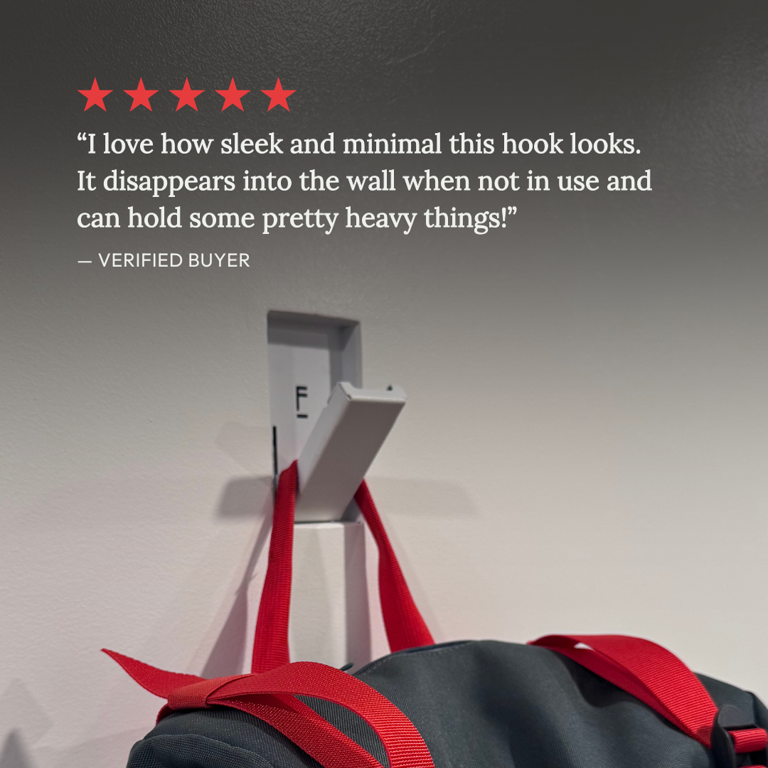 Ultra-minimalist, recessed hook. Customizable front panel with a flush finish for a seamless design that blends right into the wall when not in use. Soft-close mechanism automatically folds away when not needed. Holds up to 150 lb. Pro install in 30 minutes. Requires drywall mudding.