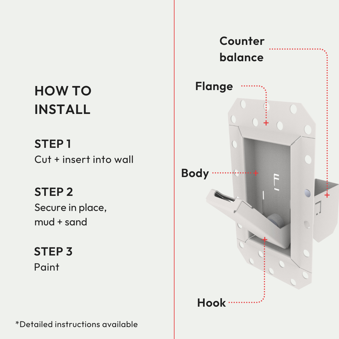 This is the Flush model. Itโs the best recessed wall hook for minimal design. It requires mudding and sanding to achieve a flush finish, so itโs best tackled by someone experienced with drywall. If thatโs not you, we recommend calling a pro! Alternatively, use the Framed Hideaway Hook [Luxe] โ installation is simple and requires minimal tools. Just cut a hole in the drywall and fasten the hook with the provided screws. Check our handy install guide for step-by-step instructions for both models.