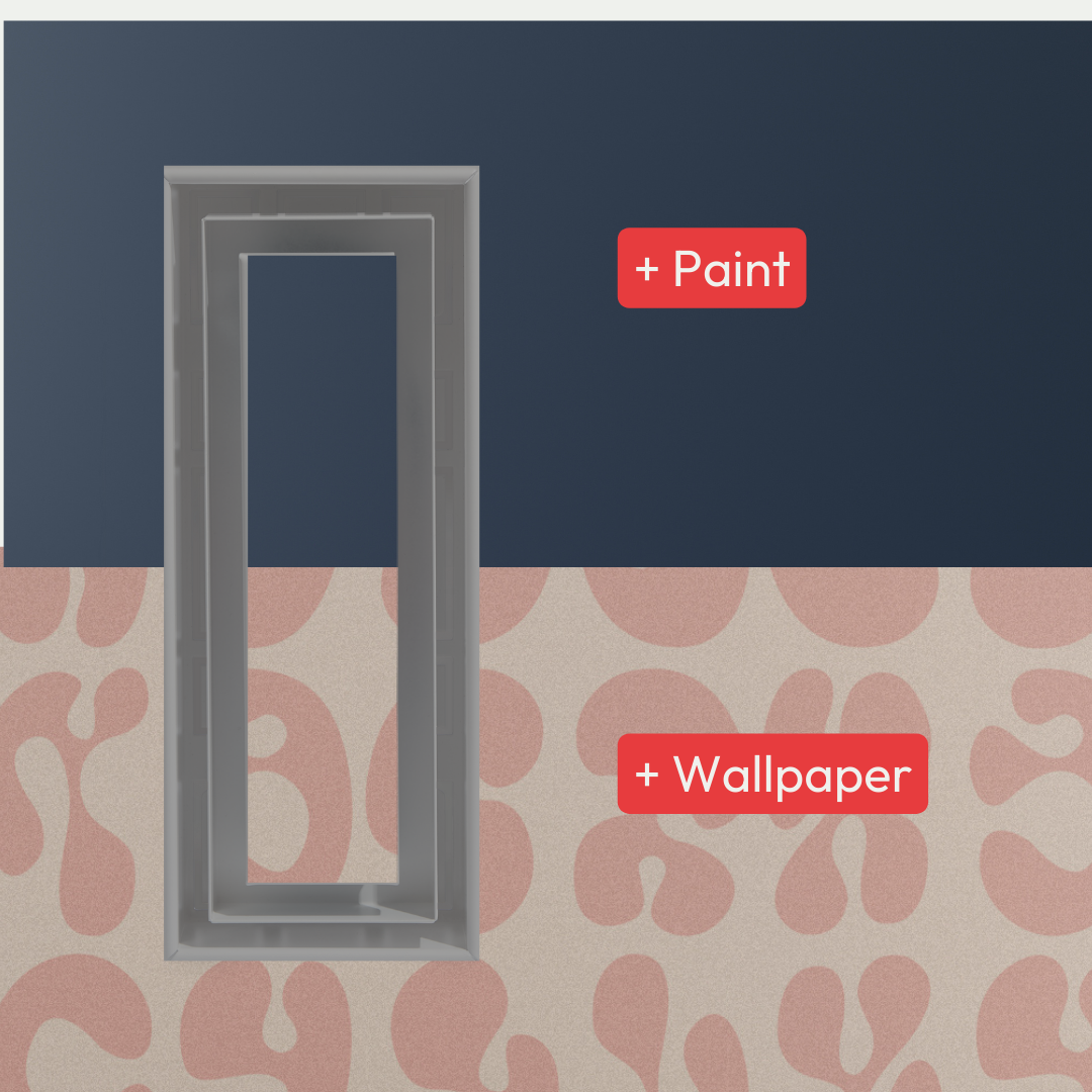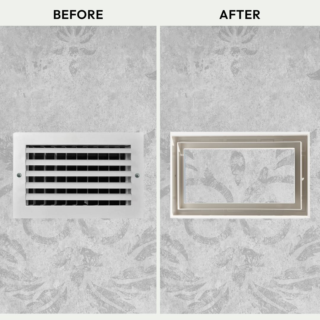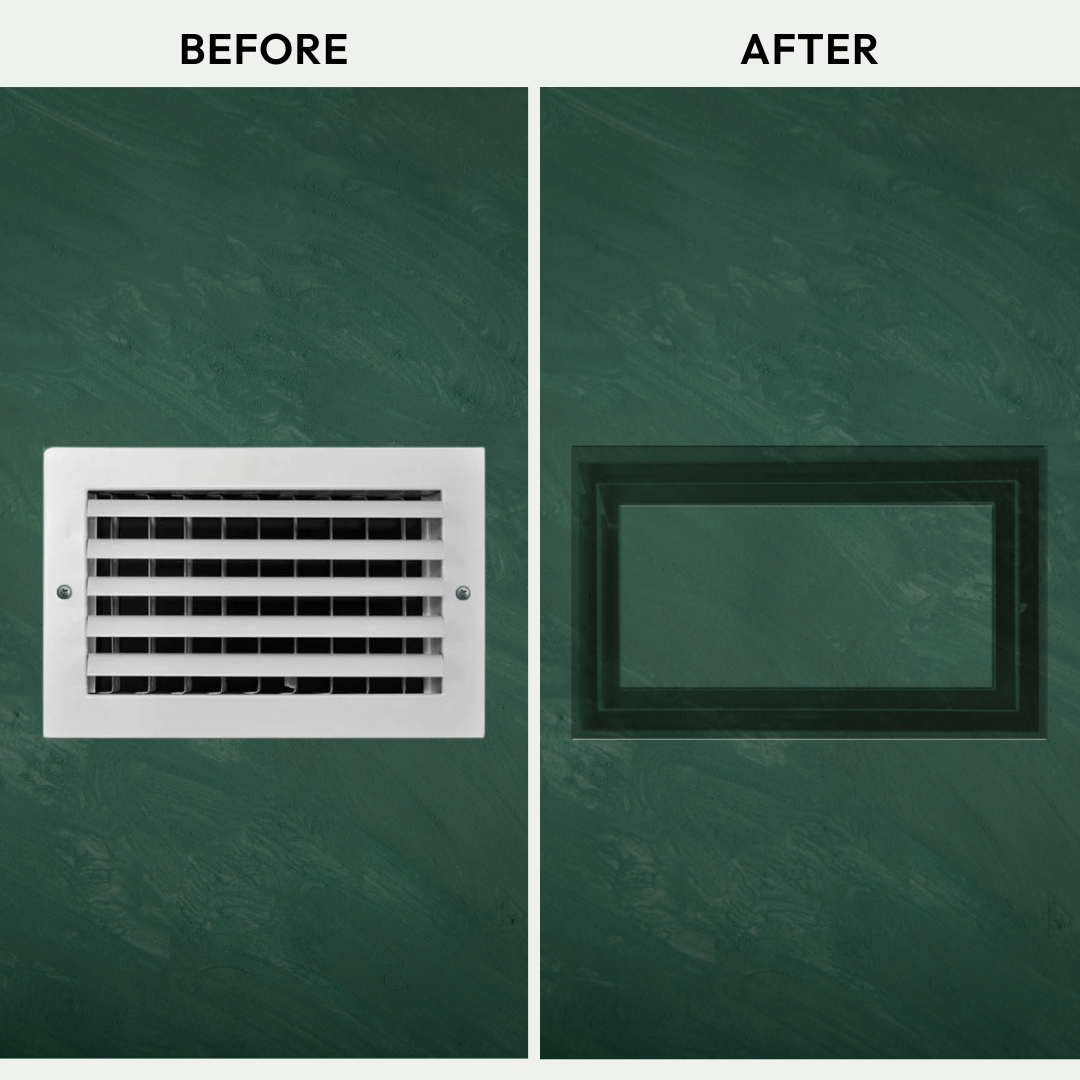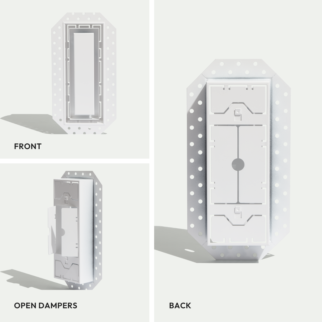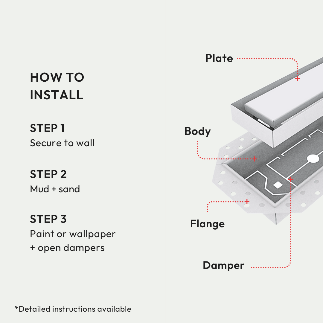 With a paintable center plate that hides the vent in plain sight — once installed, all you see is a clean rectangular air channel. The Flush is a refined upgrade that seamlessly integrates into the wall. Pro install in 30 minutes. Requires drywall mudding. Drywall and HVAC-compatible.