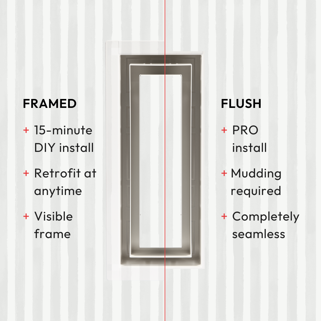 This is the Flush model, designed to sit level with the wall surface. It requires mudding and sanding for a seamless finish, so it's best installed by a pro. In contrast, the Framed model features a rim that sits on top of the wall, making it a great option for quick, easy, DIY installation.