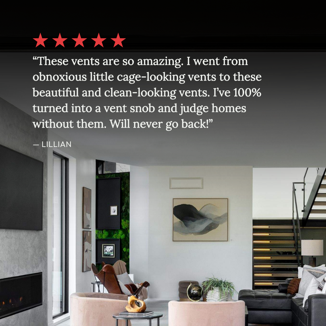 We’ve reimagined old-fashioned grill vents. This high-performance, ultra-minimalist design has all the features of the Flush Wall Vent [Luxe], plus a double air channel for luxury and power—with +50% increased airflow¹. It’s serious luxury and high performance in one, an investment in both design and airflow.