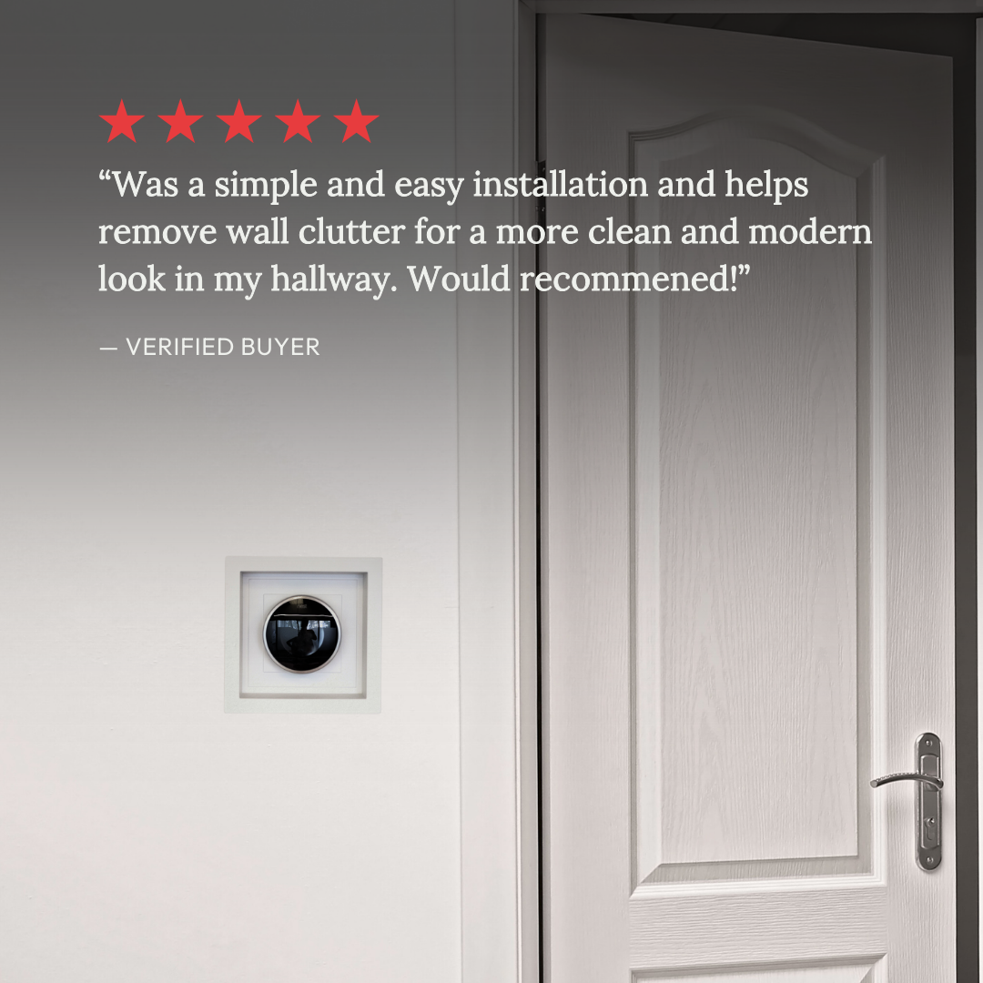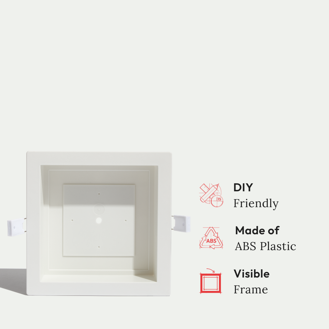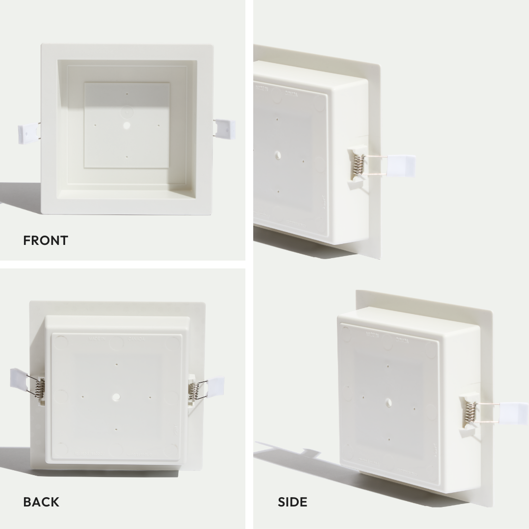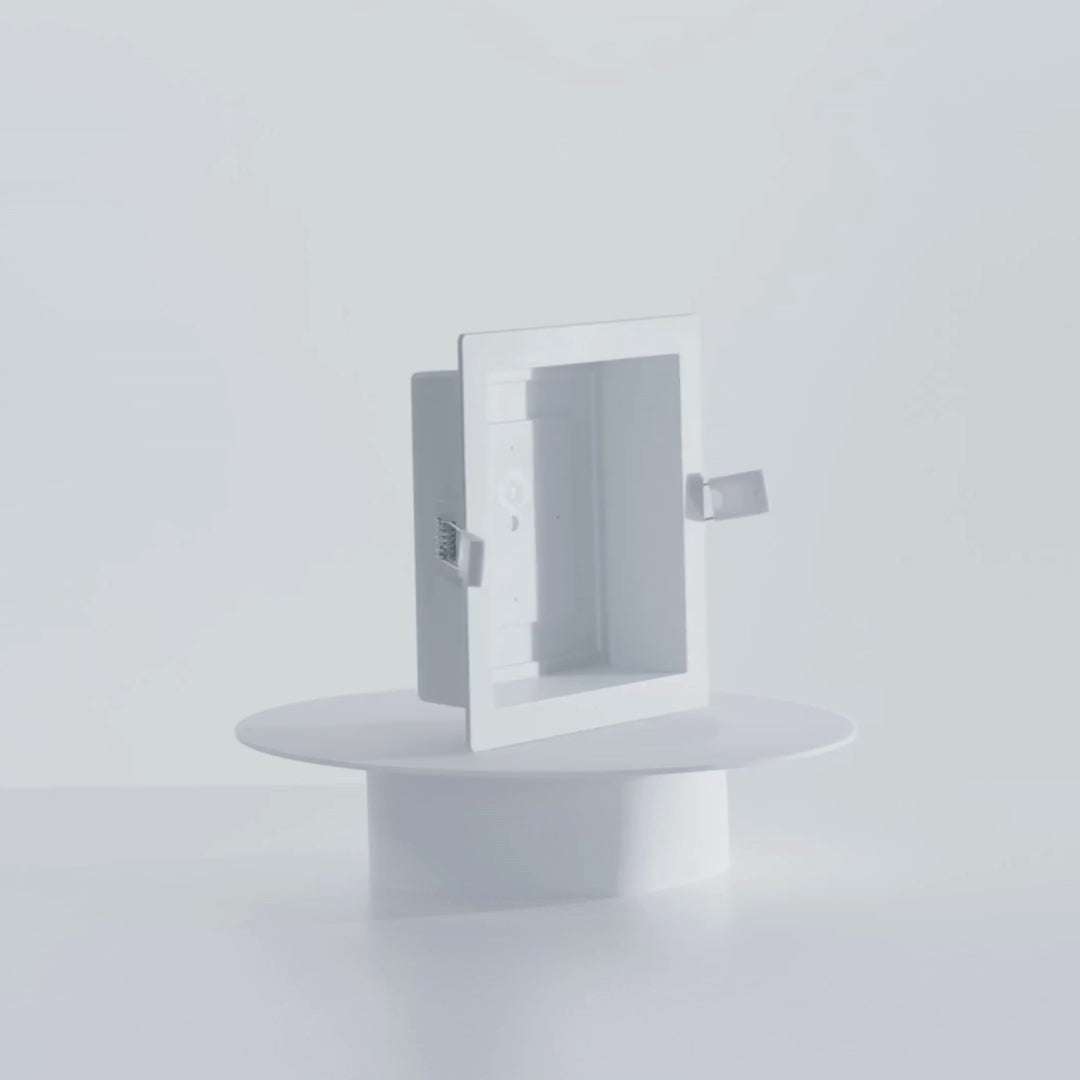 This ultra-minimalist device mount is extremely versatile and can be used to recess any small device required in the home, such as alarm panels, wireless access points, and smoke detectors. You can also use it as a recessed frame for thermostats and keypads, or a framed mount for pot lights.