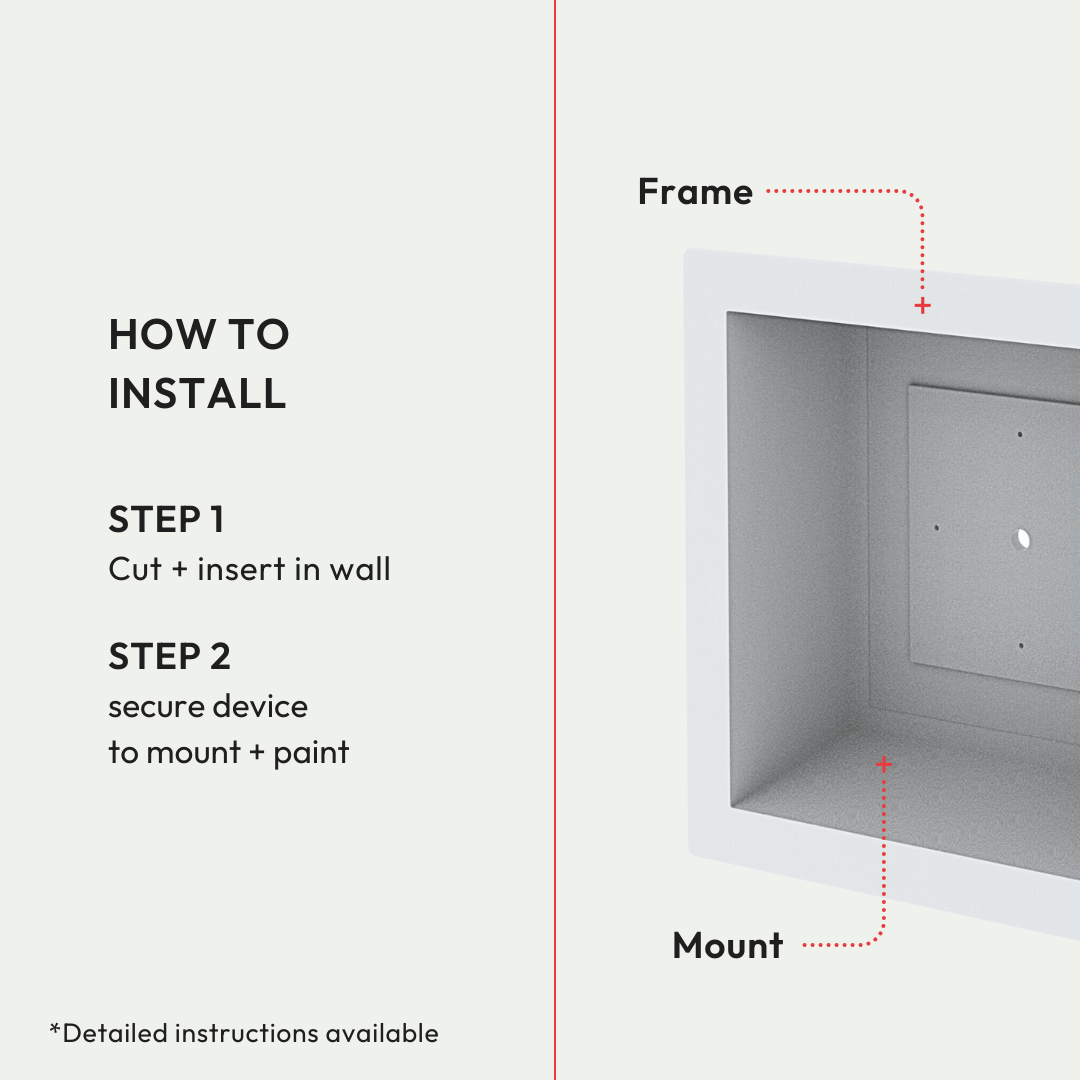 This is the Framed model โ installation is simple and requires minimal tools. Just cut a hole in the drywall and fasten the device mount with the provided screws. In comparison, the Flush model requires a bit more skill with mudding and sanding, so itโs best tackled by someone experienced with drywall. (If thatโs not you, we recommend calling in a pro!) Check our handy install guide for step-by-step instructions for both models.