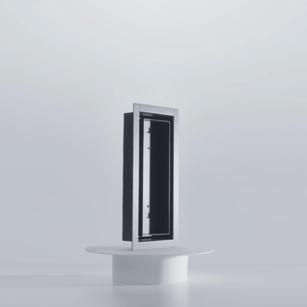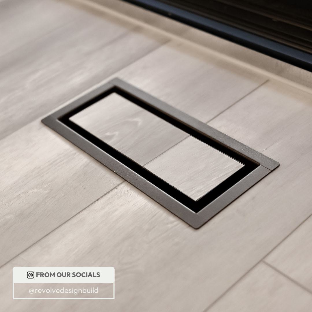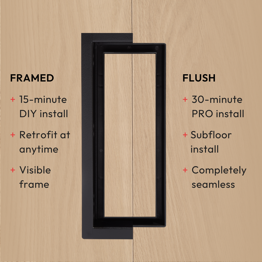 This is the Framed model, with a thin rim that sits on the surface, creating a visible border and allowing for an easy, DIY-friendly drop-in installation. In comparison, the Flush model sits level with the floor, but must be mounted at the subfloor level, before installing the surface material.