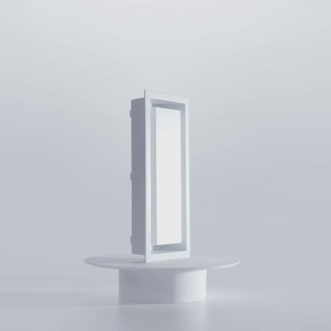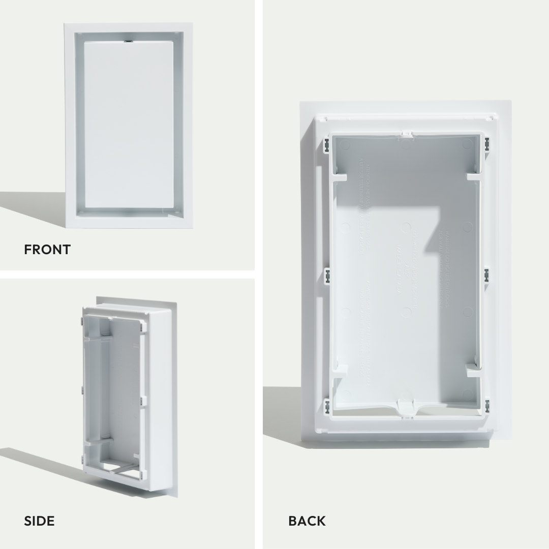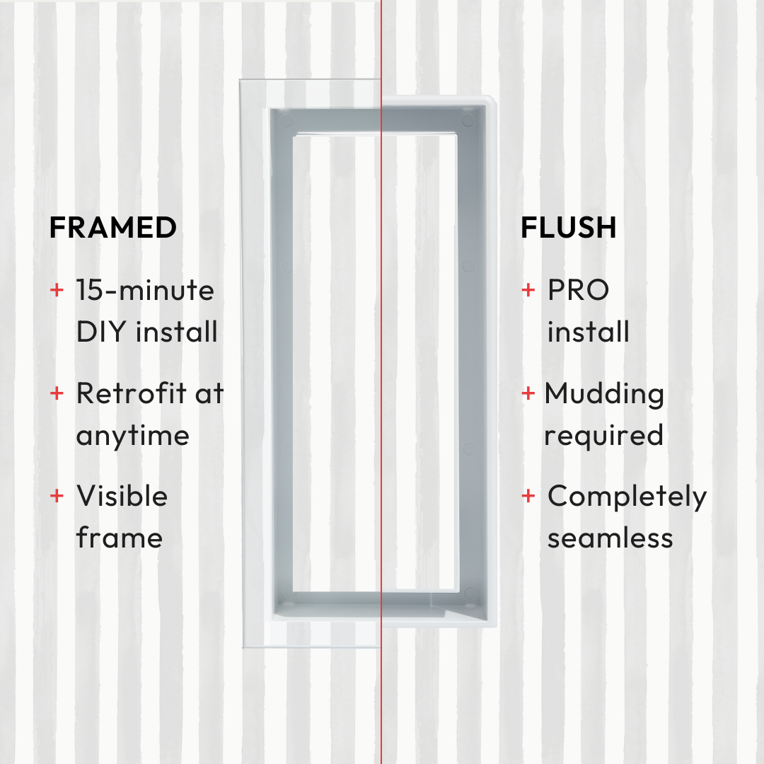 This is the Framed model, which has a visible rim that sits on top of the wall surface—making it ideal for quick, easy, DIY installation. In contrast, the Flush model sits level with the wall for a seamless look, but requires mudding and sanding during installation