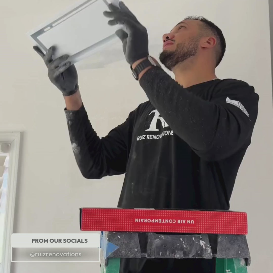 This is the Framed model—easy to install with just a few basic tools. Simply drop it into the duct and secure it with the included screws. The Flush model, on the other hand, involves mudding and sanding, so it’s better suited for someone with drywall experience. (If that’s not you, we suggest bringing in a pro!) For full step-by-step instructions, check out our install guide for both models.