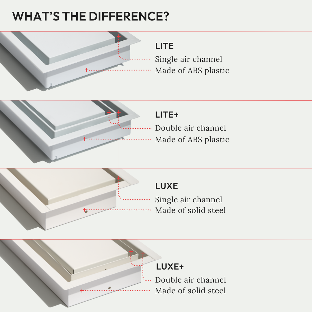 + Luxe and Luxe+ are crafted from solid steel—Luxe delivers a premium, built-to-last design with a single channel, while Luxe+ doubles the airflow, delivering +50% more airflow than standard Luxe.