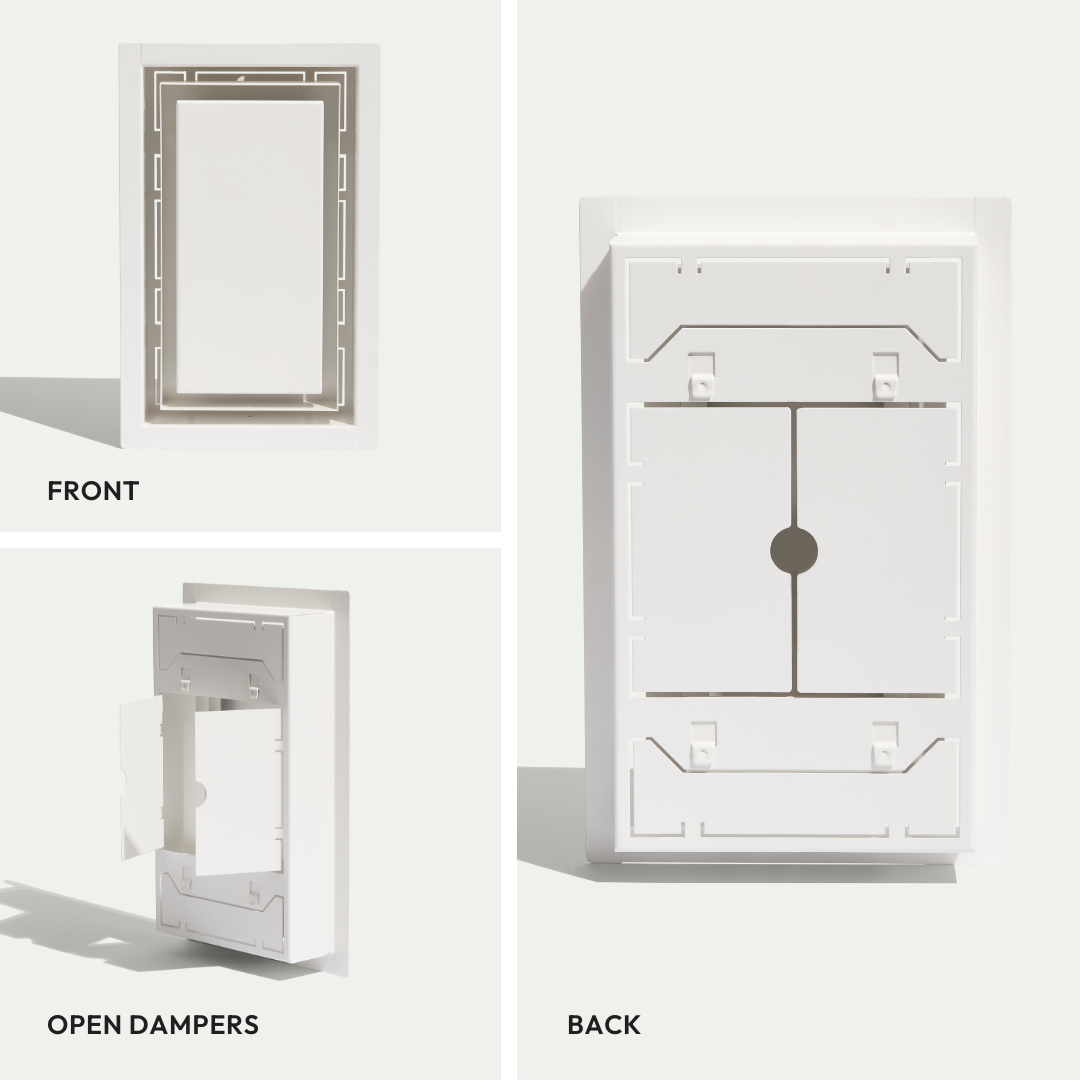 A paintable center plate hides the vent in plain sight. Includes integrated dampers. Super-easy, DIY-install in 15 minutes. Retrofit anytime. Drywall and HVAC-compatible.