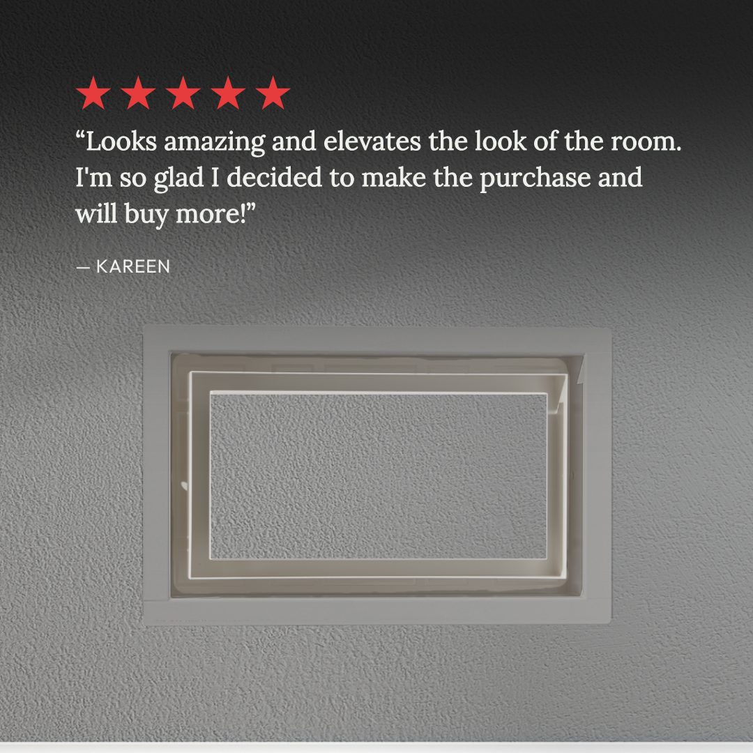 We’ve reimagined old-fashioned grill vents.This high-performance, ultra-minimalist design has all the features of the Framed Wall Vent [Luxe], plus a double air channel for luxury and power—with +50% increased airflow¹. It’s serious luxury and high performance in one, an investment in both design and airflow.