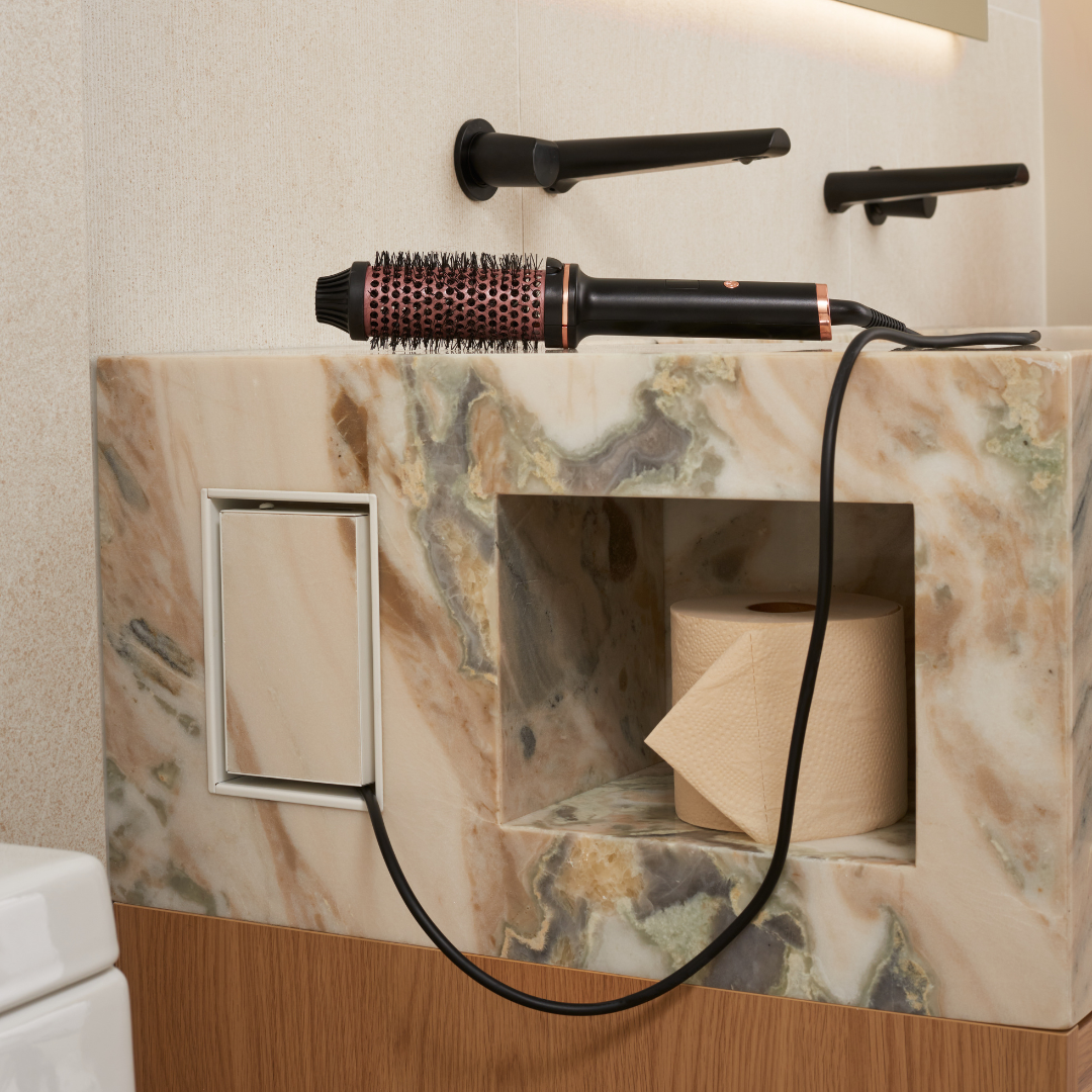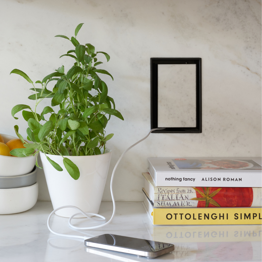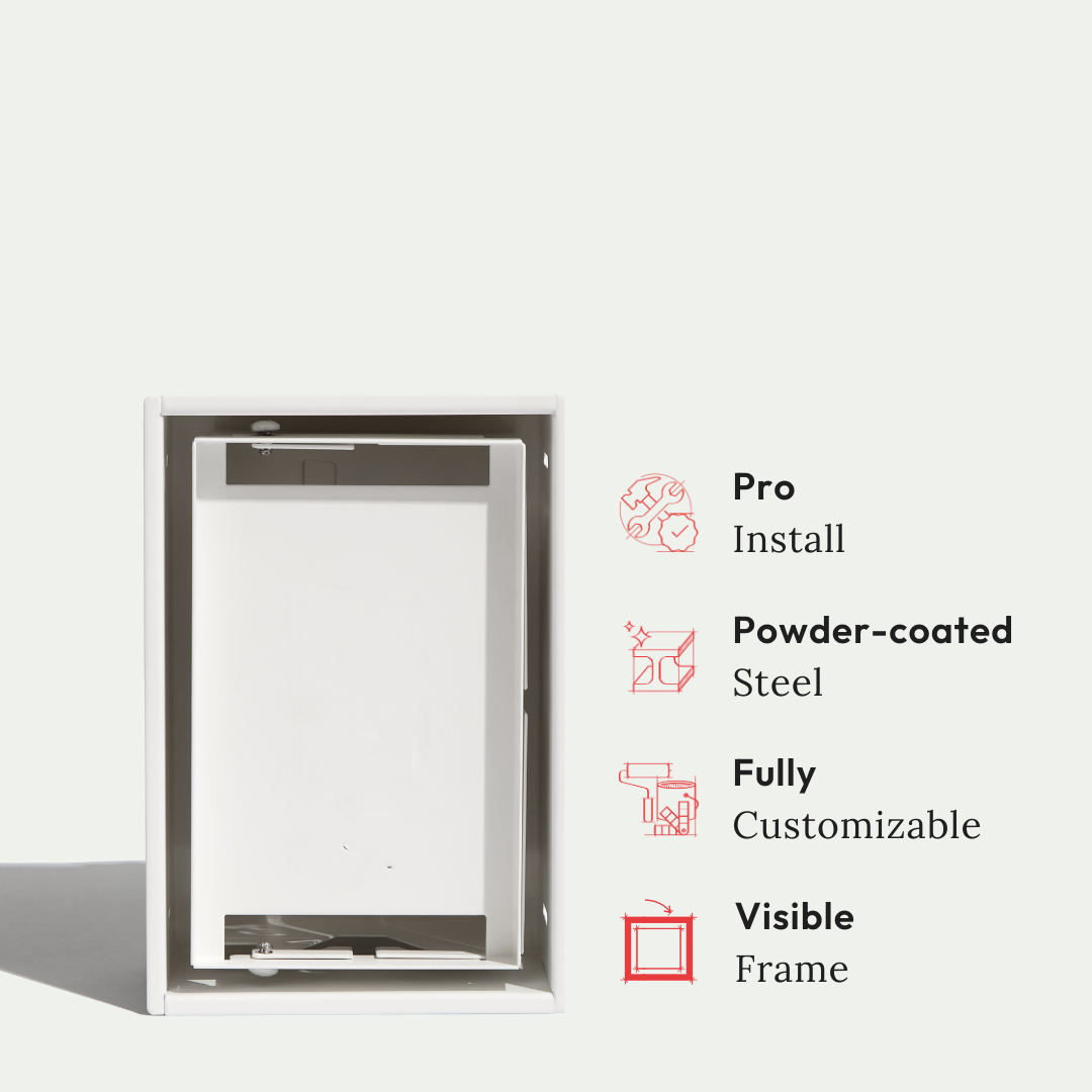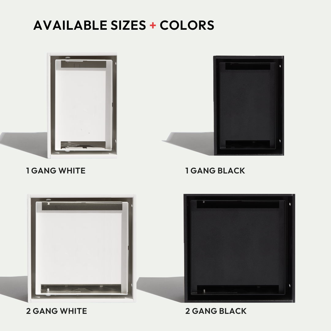 This is the Framed model, a concealed receptacle mount with a rim that sits on top of the wall surface, creating a visible border and allowing for an easy, DIY-friendly drop-in installation. In comparison, the Flush model is designed to be mudded in, creating a seamless, contoured look that blends into the wall, so it’s best installed by a professional.