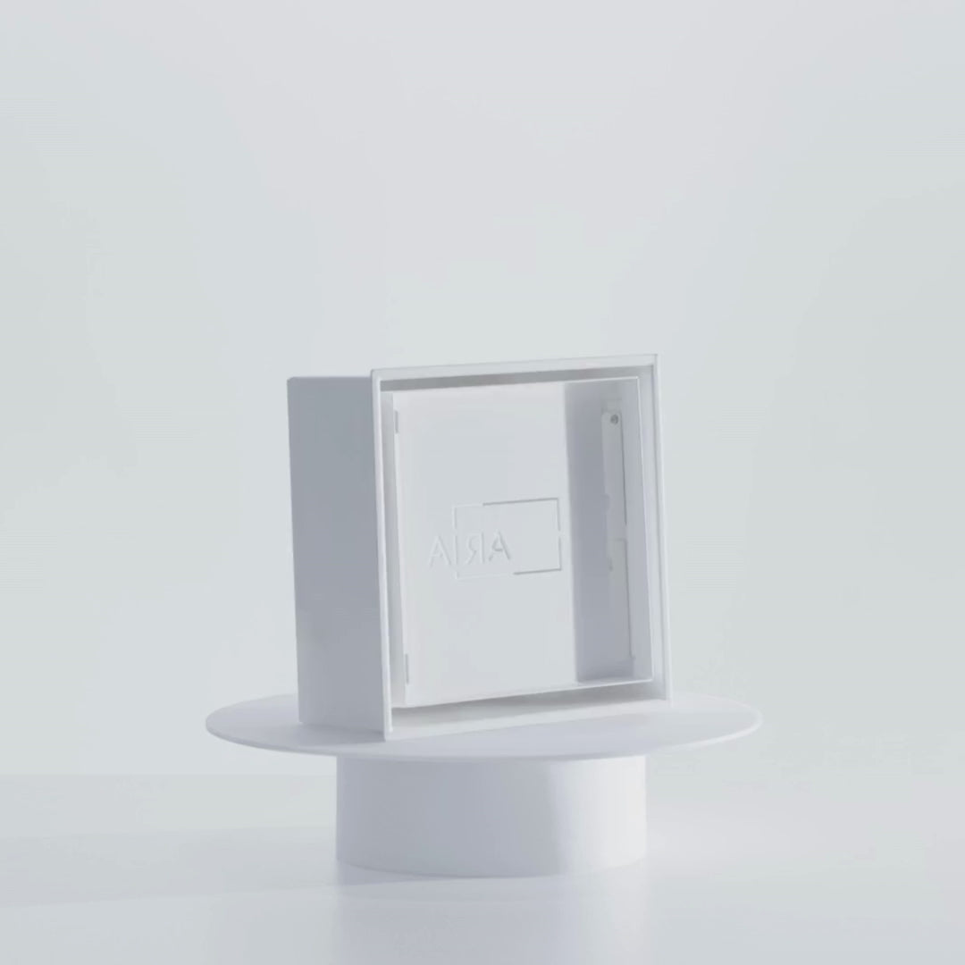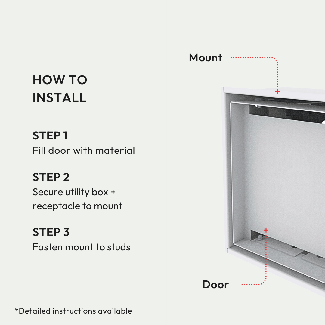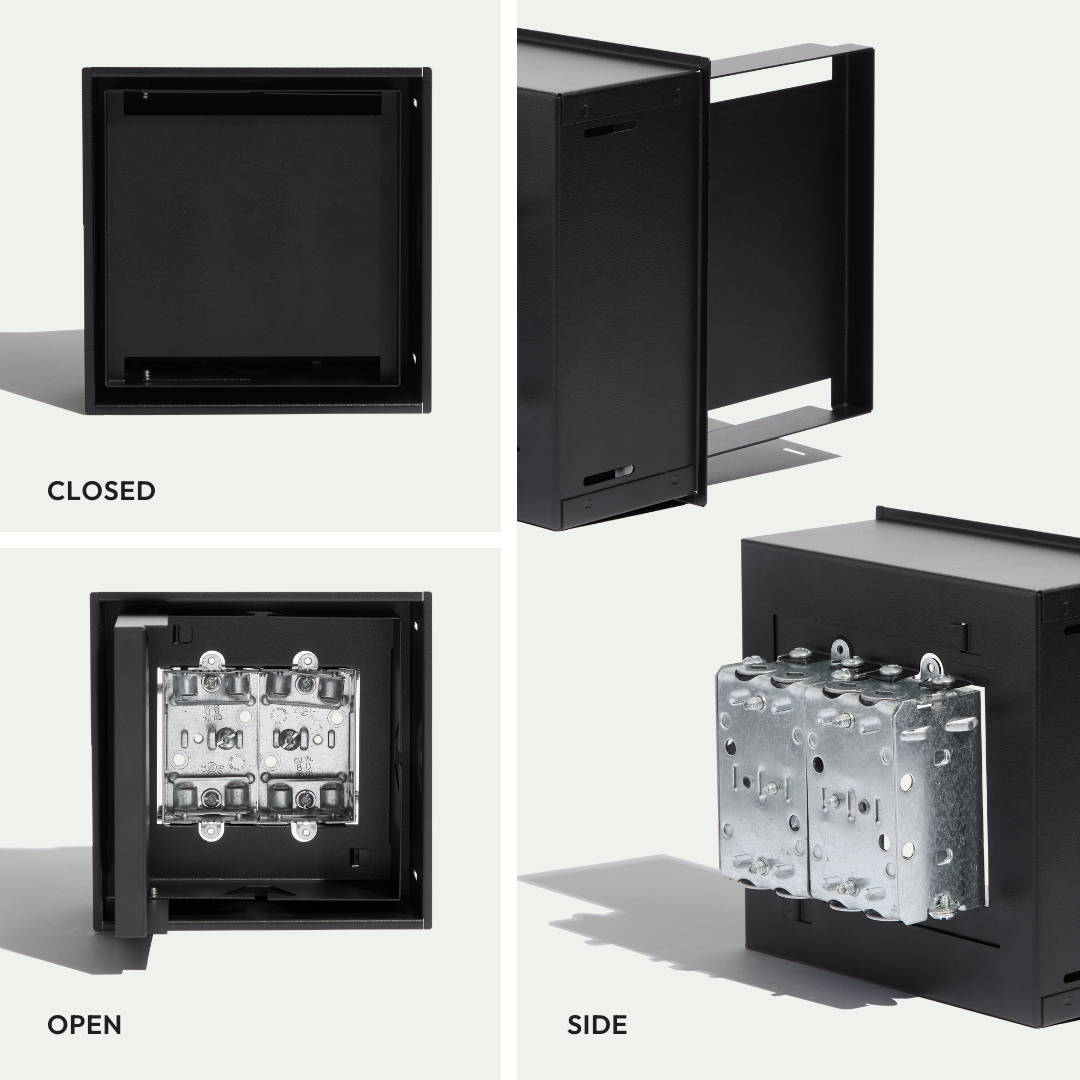 Ultra-minimalist receptacle mount for light switches, outlets, Ethernet ports, and more. Customizable hinged door with a framed finish for a seamless design that blends right into the wall — once closed, only a rectangular groove is visible. Pro install in 30 minutes. Requires wiring and install of surface material. Works with all materials.